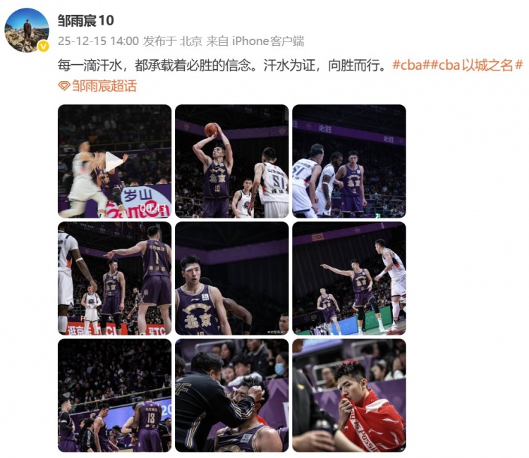 今天邹雨宸发文写道:“每一滴汗水,都承载着必胜的信念。汗水为证,向胜而行。”