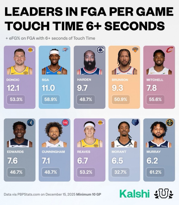 >持球时间6+秒后出手频率:东契奇12.1次领跑 亚历山大第2 哈登第3