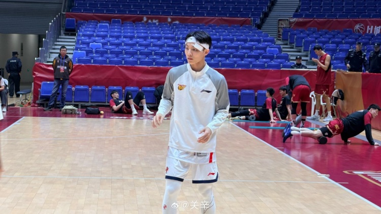 赛前,广东体育频道记者关辛发博晒照,广东后卫徐杰戴着发带在赛前进行热身。
