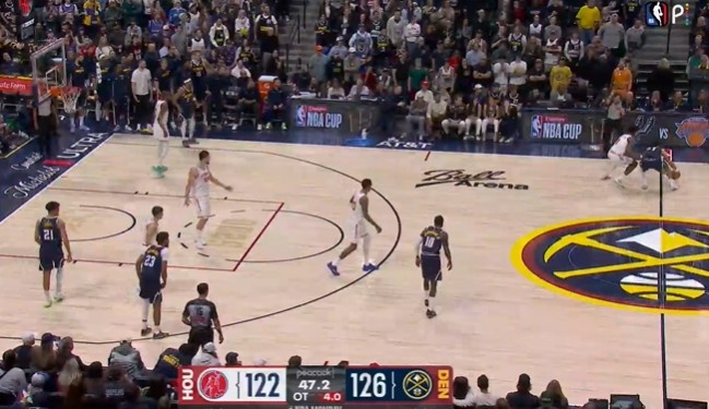 此外,在第四节最后2.3秒,针对阿门的无球犯规判罚,经回放审核被认定为挑战失败,阿门的左膝撞到了小哈达威的右脚后跟,导致后者向前倾倒,随后在倒下过程中发生了进一步的接触,这个判罚没有问题。