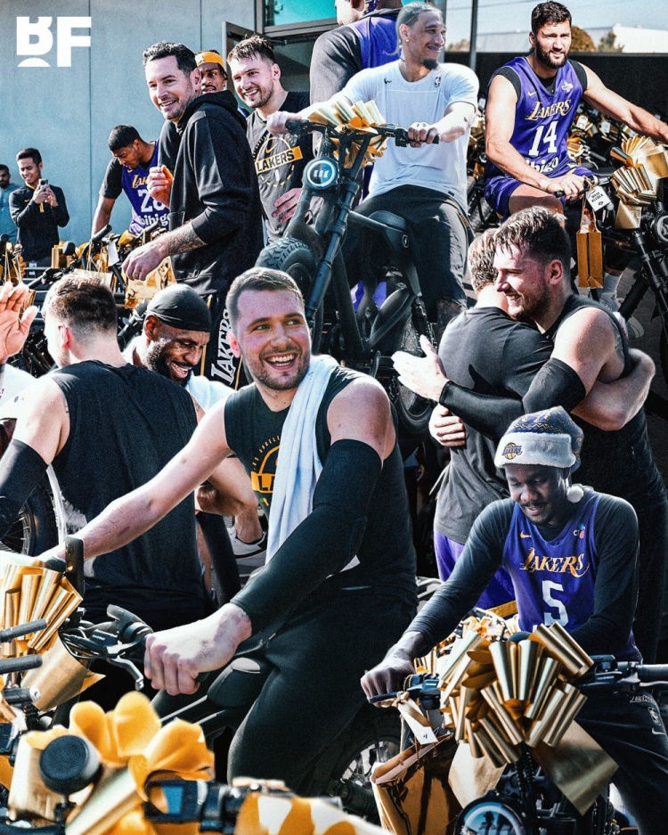 直播吧12月17日讯 据此前报道,东契奇今天为湖人全体队员、教练组成员及篮球运营部门工作人员,每人赠送了一辆全新的电动助力自行车(E-Bikes),合计100多辆。