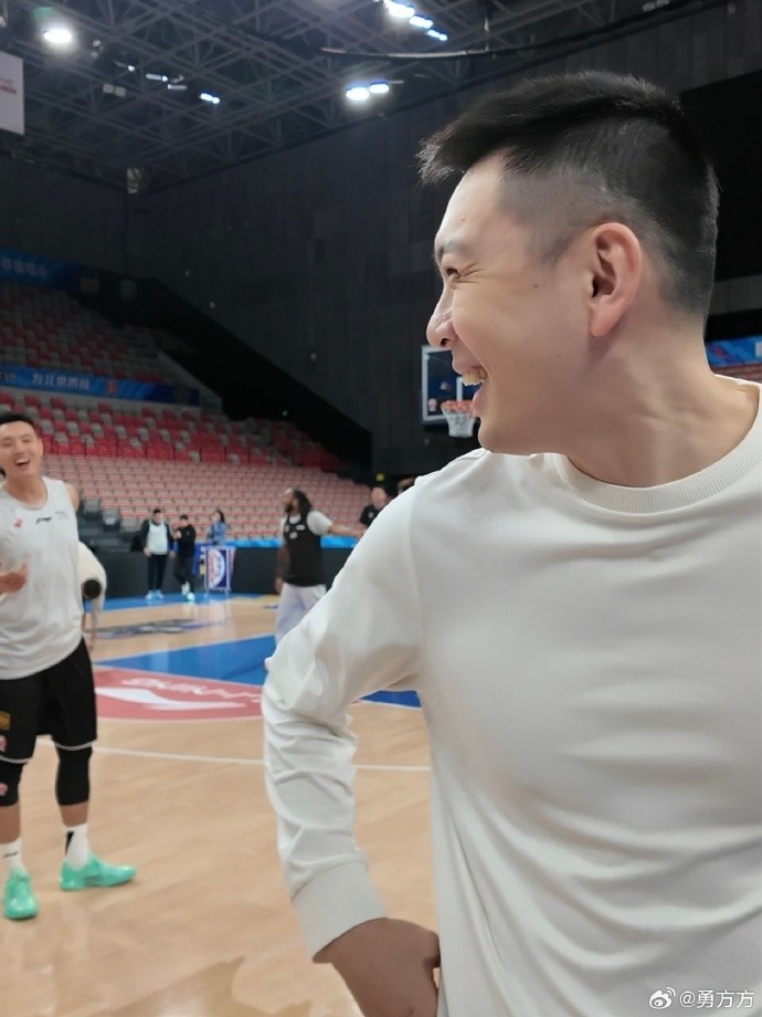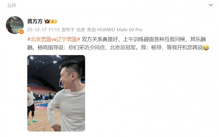 @勇方方 在个人微博上写道:“双方关系真是好,上午训练碰面各种互致问候,其乐融融。杨鸣指导说:你们采访少问点,北京总冠军。我:杨导,等我开机您再说。”