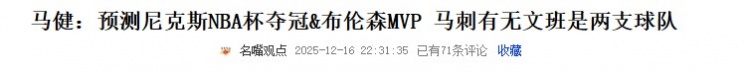 马老师懂球!马健昨日预测尼克斯夺冠&布伦森MVP 结果完全一致