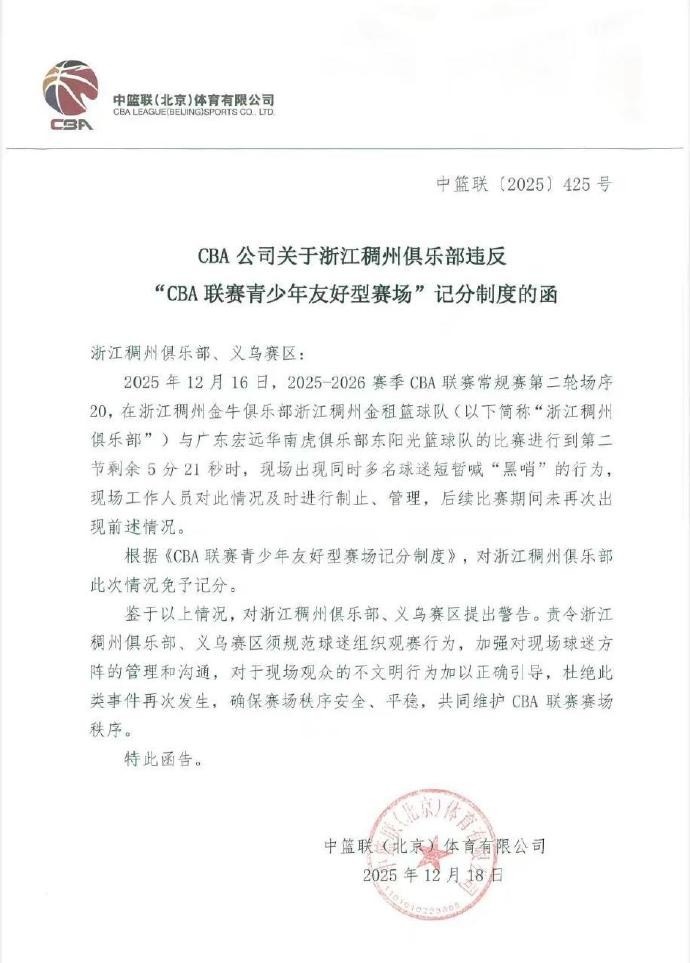 主场球迷大喊“黑哨”!CBA官方对浙江男篮、义乌赛区发出警告