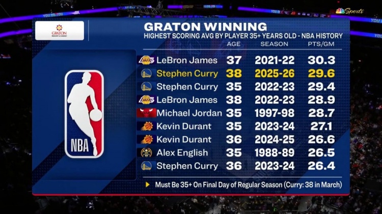 2、斯蒂芬·库里(38岁,2025-26赛季)场均29.6分