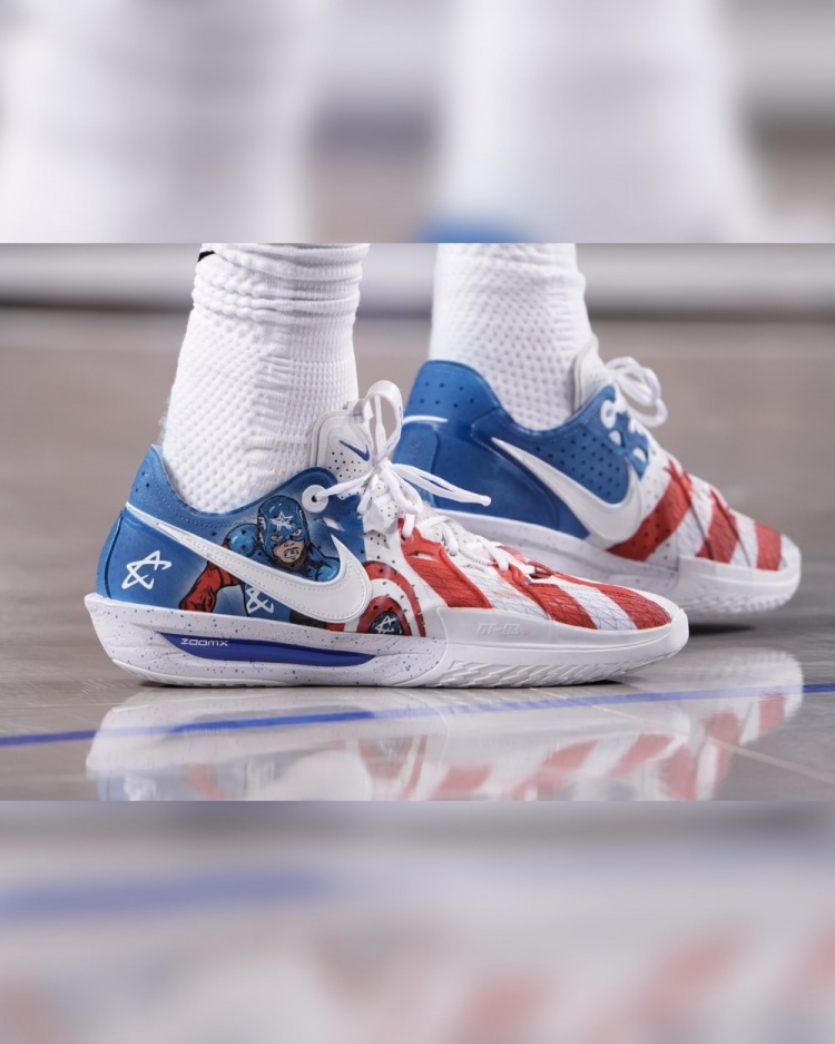 本场比赛,康宁汉姆穿上了客制版本的Nike GT Cut 3 PE,在美国队长主题基础上,将个人Logo融入到了美队的形象当中。