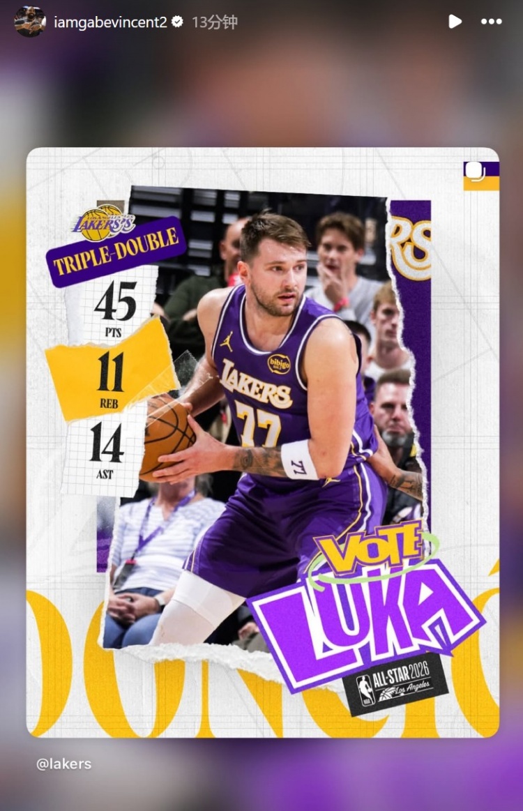 赛后,因伤缺阵的文森特转发了东契奇的大号三双数据海报。