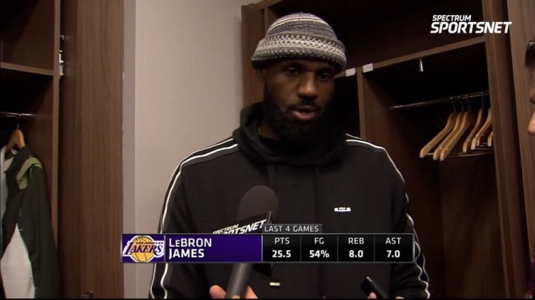 直播吧12月19日讯 今日,湖人143-135客场击败爵士,迎来两连胜。赛后,湖人前锋詹姆斯接受了采访。