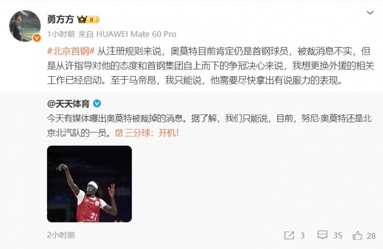 @勇方方 在个人微博上写道:“从注册规则来说,奥莫特目前肯定仍是首钢球员,被裁消息不实,但是从许指导对他的态度和首钢集团自上而下的争冠决心来说,我想更换外援的相关工作已经启动。至于马帝昂,我只能说,他需要尽快拿出有说服力的表现。”
