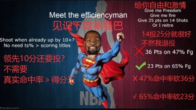 这支队问题一大堆,阵容搭配非常别扭。另一方面,当KD本可以更主动时(抛开防守注意力不谈),我有点理解“效率曼巴”这外号咋来的了。