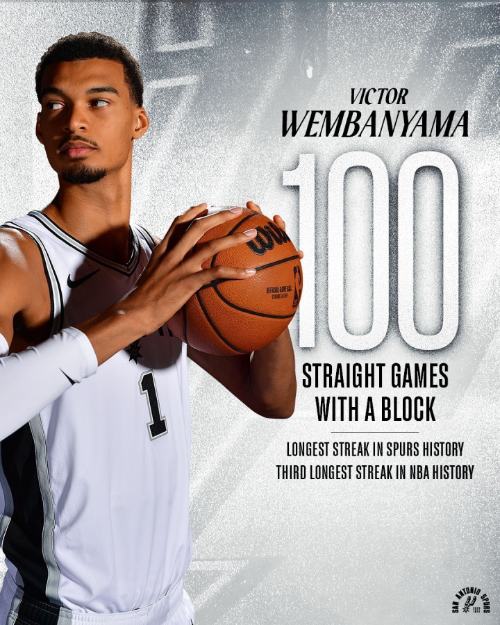 文班在第三节连续送出两记盖帽,成为历史上第三位至少连续100场有盖帽进账的球员,前两位是尤因(145场)和穆托姆博(116场)。