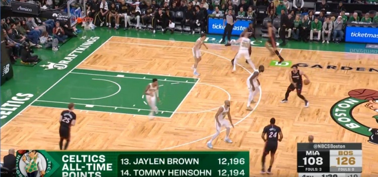 第四节比赛,杰伦·布朗通过上篮得到个人本场第30分,生涯总得分达到12196分,超越汤米·海因索恩,排名凯尔特人队史第13位。