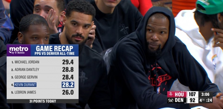打掘金历史场均得分榜:杜兰特28.2分第四 乔丹29.4分第一