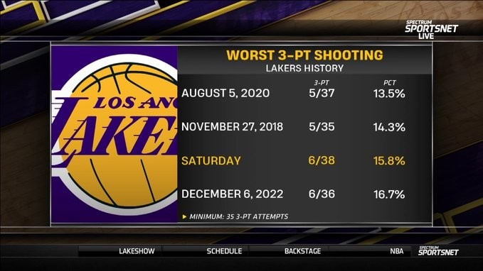 湖人全场三分球38中6 命中率15.8%&在队史35+出手的比赛里第三低