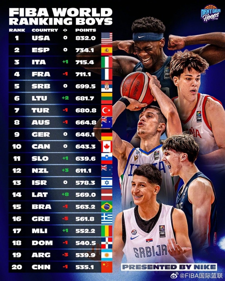 FIBA更新U系列男篮实力榜!美国第一 西班牙第二 中国第20
