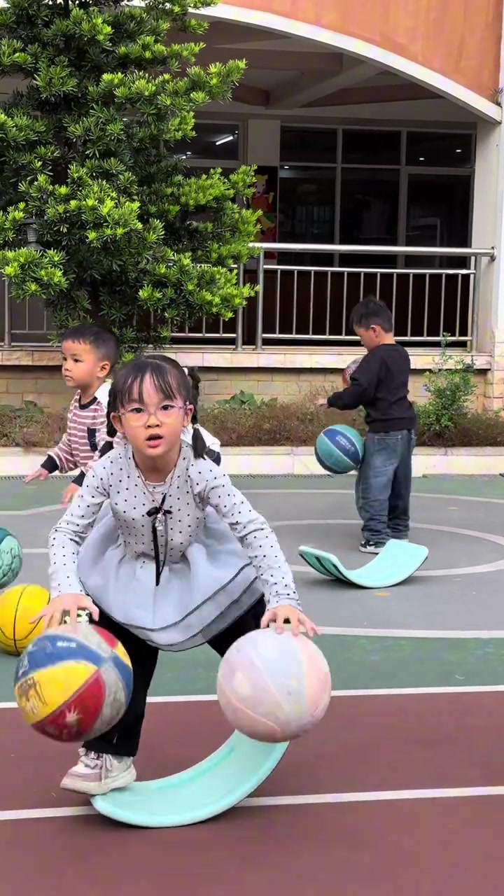 >篮球和跷跷板结合有没有搞头?女娃跷跷板上左摇右晃双手流畅运球