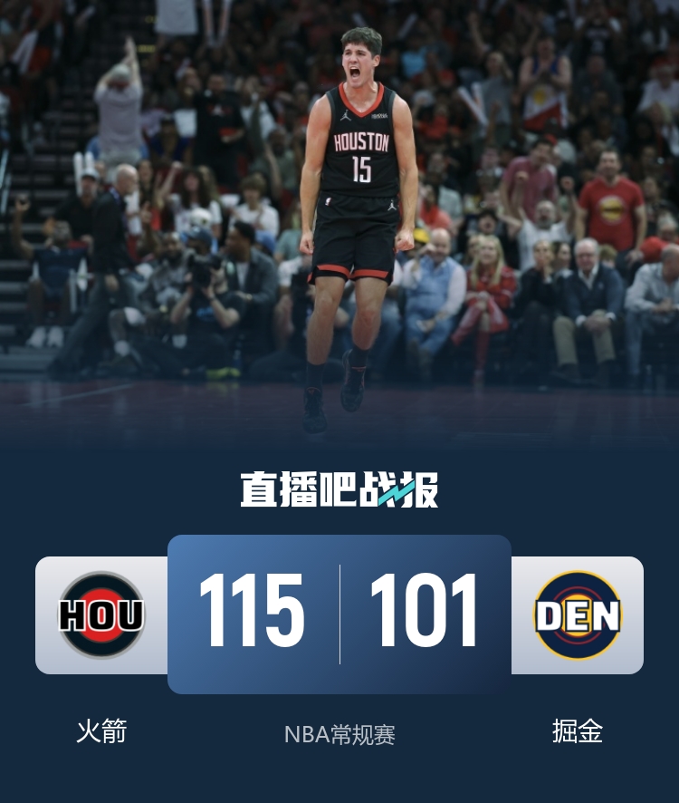 比赛开始,火箭反客为主10-2开局,但约基奇又传又攻带队追平比分,随后谢泼德上来连中3记三分,但斯潘塞·琼斯也能回应,首节掘金领先3分,次节瓦兰上来连得6分后掘金突然断电,杜兰特找回手感,奥科吉也连中3记三分,火箭11-0一度领先双位数。下半场,双方展开拉锯战,火箭保持10分左右领先,不到半节约基奇4犯下场,最后1分多钟谢泼德连中3记三分轰下11-0拉开16分领先,末节小阿德尔曼又被驱逐,杜兰特单节再上双带队拉开20分以上领先,最终火箭115-101复仇掘金。