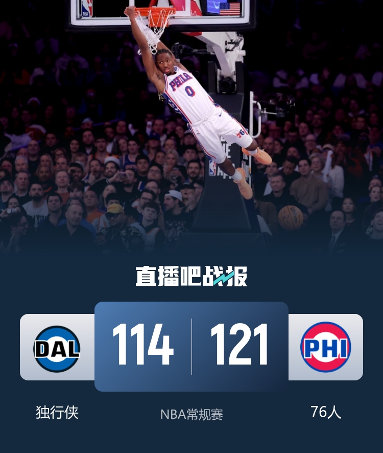 比赛开场,独行侠率先发力,通过转换进攻建立领先优势,但随后又突然断电,76人打出一波11-0领先到两位数,首节结束76人38-30领先。次节回来,双方陷入拉锯战,独行侠稳扎稳打一度反超比分,但76人很快又再次建立优势,浓眉和巴洛在双方篮下予取予求,马克西则依旧维持主攻状态,半场砍下22分,帮助76人68-62领先进入下半场。易边再战,场上形势风云突变,独行侠全队发力打出一波10-0将比分反超,三节结束以97-91领先。末节回来,局势再次出现逆转,独行侠进攻端再次断电,马克西继续主攻表现帮助76人重新确立优势,此后稳扎稳打没再给独行侠机会,最终76人121-114力克独行侠。