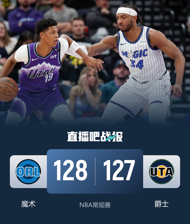 比赛上来,两队就打得十分胶着,场上比分交替领先,班凯罗单节得分上双,爵士这边老将乐福连中三分球,首节双方就轰下74分之多,次节爵士的命中率出现下滑,魔术逐渐将分差拉开到两位数,好在是爵士连拿八分及时止血,半场结束时魔术领先5分;下半场回来,爵士迟迟未能得分,魔术连拿五分再次建立起两位数的领先,爵士虽有反扑但又被对手一波13-0的攻势压制,末节爵士再打一波9-0的反扑势头,关键时刻贝恩失误被科利尔上篮追平,班凯罗绝杀三分不中,比赛进入加时,加时赛两队都难以得分,关键时刻乔治轰进3+1反超,贝恩上篮绝杀,最终魔术加时险胜爵士。