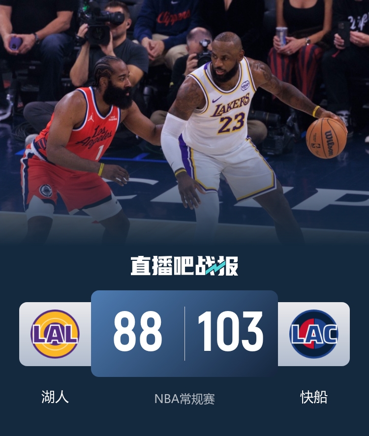 首节之争湖人攻防表现完全不在线,前8分钟里仅得9分直接导致开局就落后,快船则火力全开轰出26-9的攻势直接确立起两位数领先,不过祖巴茨踩到詹姆斯的脚导致脚踝扭伤退出比赛;湖人这之后进攻端稍稍回暖但无力填埋1大坑,祸不单行的是东契奇左腿挫伤也在下半场退出比赛,半场结束时快船手握15分领先。休息归来快船一直保持优势占据场面主动,第三节分差一度来到22分,不过湖人末节反弹送上10-0的攻势突然看到希望;快船随后及时找回感觉止住颓势,末段哈登的3+1和科林斯的2+1将优势重新拉大至16分奠定胜局。最终,快船主场力克湖人结束5连败。