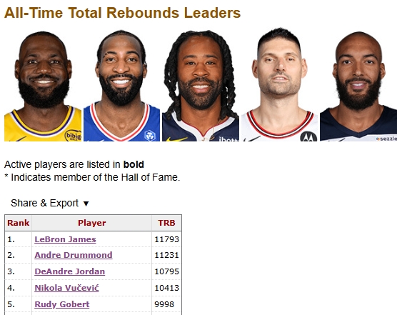 NBA现役球员只有四人篮板比他多,他们是詹姆斯11793、庄神11231、小乔丹10795、武切维奇10413。