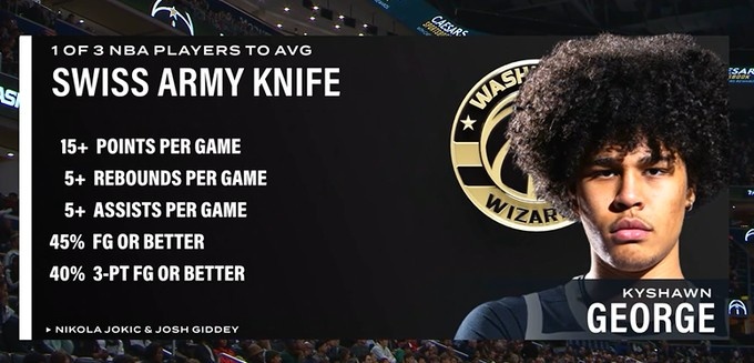 奇才VS马刺,转播方晒出凯肖恩·乔治的数据:本赛季他场均15+5+5,命中率超过45%,三分超过40%,除他之外,联盟仅有约基奇和吉迪同时达成了这几项数据。