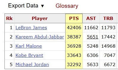 他也成为NBA历史上第6位生涯至少得到30000分5000助攻和5000篮板的球员,此前5位分别是:詹姆斯、乔丹、科比、贾巴尔和卡尔·马龙。