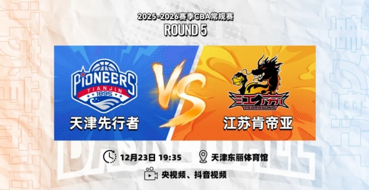 12月23日19:35,2025-26赛季CBA常规赛第五轮,江苏肯帝亚将奔赴三连客的首个客场,挑战天津先行者。