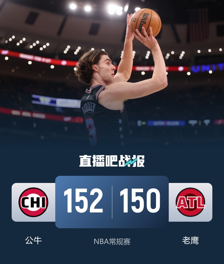 上半场,公牛反客为主率先发力,开场三分7中5取得两位数领先,老鹰暂停调整后奋力反击,三分4连击一度反超,次节双方继续对攻,老鹰延续外线手感不断飙中三分,公牛频频冲击内线得手强势回应,布泽利斯高效输出,半场战罢公牛83-73领先老鹰。下半场,老鹰火力全开,杰伦·史密斯和特雷·杨联手带队一度反超,公牛及时回暖稳住局势,末节公牛连投带罚取得领先,特雷·杨得分助攻一肩挑带队追赶,关键时刻吉迪三分命中并助攻奥科罗反击得手,老鹰连中三分追到只差1分,特雷-杨绝平失手。最终,公牛152-150力擒老鹰。