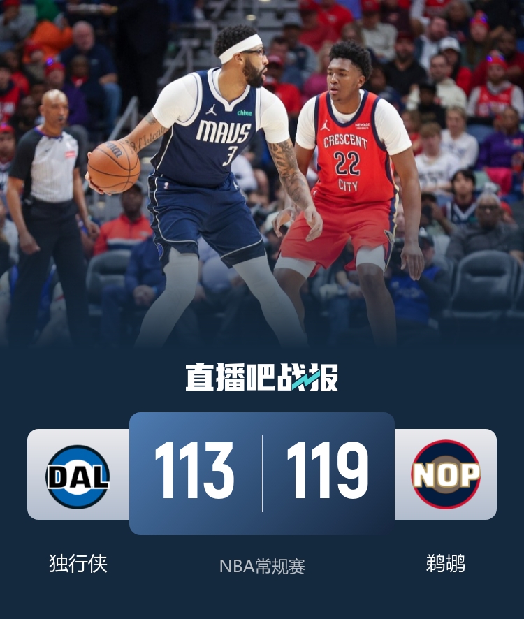 首节之争鹈鹕半节时间送出22-11的攻势早早确立起领先优势,不过后半段独行侠找到感觉后开启对攻模式,他们后半段回敬一波23-16的攻势追至2分结束第一节。次节独行侠很快反超比分并开启拉锯战,末段他们抓住机会送出一波15-6的攻势拉开比分并奠定半场6分领先。休息归来双方独行侠占据上风再度确立起两位数领先,但几次拉开比分都无法守住优势,末节普尔突然爆发连砍10分,鹈鹕送上一波15-4的攻势一举抹平劣势开启最后决战。末段锡安也站出来连拿关键6分,鹈鹕送出8-0的攻势奠定胜局。最终,鹈鹕力克独行侠迎来5连胜。