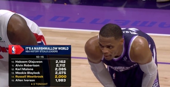 鬼手神偷!威少本场已送出3抢断 总数2000排在抢断榜第14位
