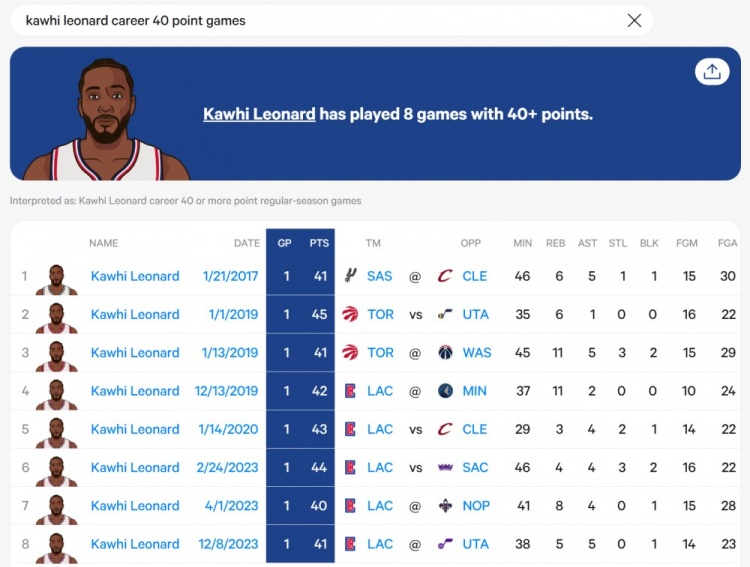 本场比赛,莱昂纳德首发登场36分50秒,23投16中,三分5中4,罚球5中5,狂砍41分8篮板5助攻,正负值+25全场最高。