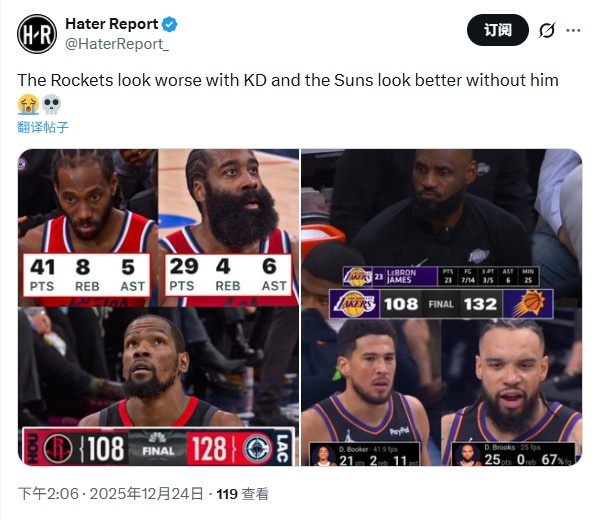 火箭输快船&太阳赢湖人!美媒:火箭有KD更差了 太阳没他更好了