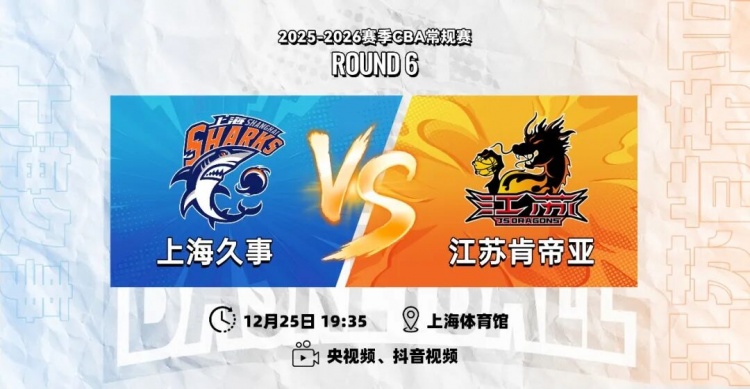 12月25日19:35,2025-26赛季CBA常规赛第六轮,江苏肯帝亚将继续连客之旅,二番挑战上海久事。