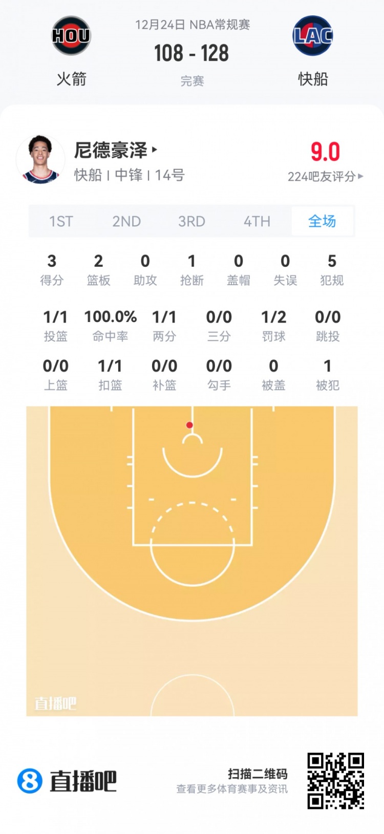 快船首轮30号秀尼德豪泽 登场15.4分钟