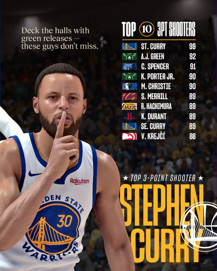 直播吧12月24日讯 今日NBA 2K官方晒出了最新联盟三分能力值前十球员,具体如下: