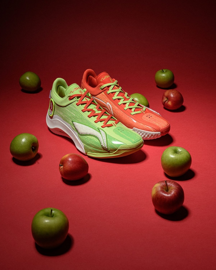球鞋采用鸳鸯配色,鞋面还带有类似苹果的纹理,而在鞋后跟处,分别写着拼音拼写的杨瀚森姓名还有“young handsome”。