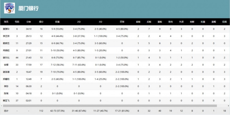 球队方面,厦门白鹭整体投篮命中率达到57.5%,两分命中率更是达到67.4%,这两项命中率都远高于对手;40.7%的三分命中率,比对手的42.9%略低;篮板上,厦门白鹭以40-25压制住对手,前场篮板8-5也比对手多3个;助攻上,厦门白鹭19-15比对手多4个,失误上,厦门白鹭这场比赛控制得不错,仅12次失误,比对手的14个少2个。球员方面,全队有7名球员得分上双,谢泼德和安娜依然表现稳定,虽然都只出场半场时间,但也分别拿下19分和17分;谢尔比本场比赛也拿到13分5篮板,黄雅玲拿到16分9篮板,赖婷艺拿到15分6篮板,李艺萍、肖婉钰和郑馨茹也都有不错发挥。12月27日,厦门白鹭女篮将重回主场迎战河南豫光金铅,希望球队延续出色的状态,在主场继续连胜的脚步。