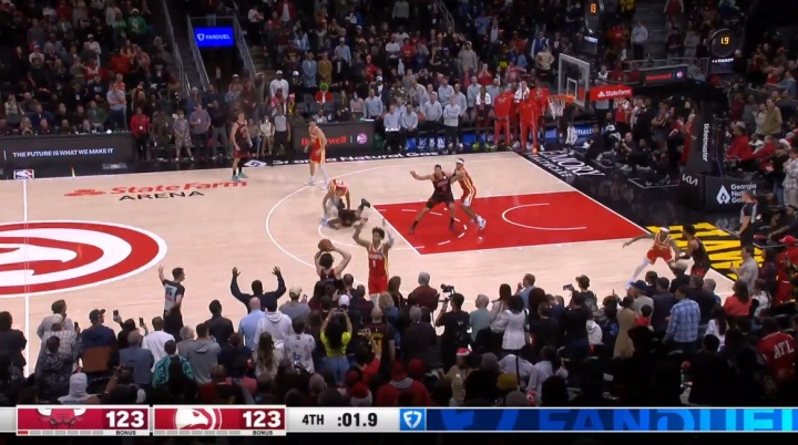 第四节21.3秒,特雷·琼斯在亚历山大-沃克的行进路线上建立了一个宽阔的掩护位置,他的伸出的手臂与对方发生了接触,应吹罚掩护犯规,这是一次漏判;