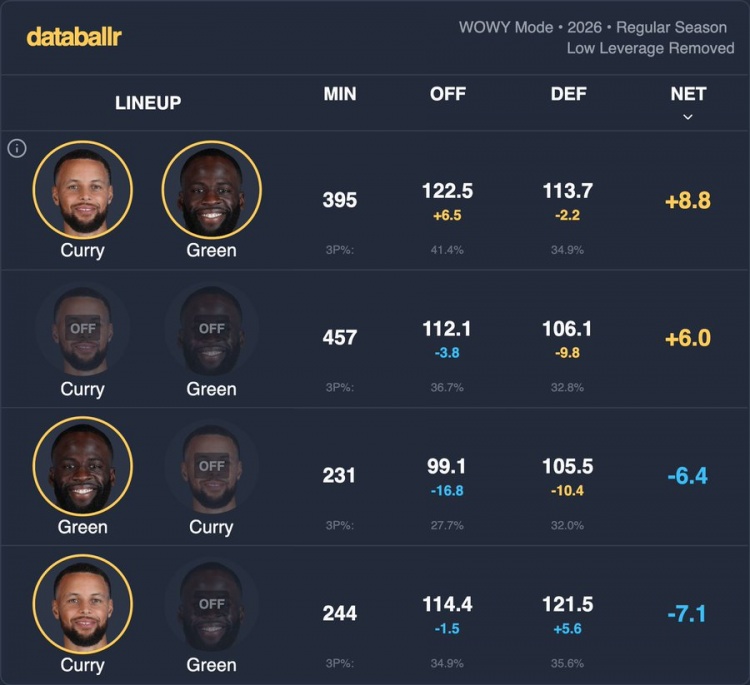 本赛季库追同场勇士净效率+8.8 都不在场+6.0 但单独在场都是负的