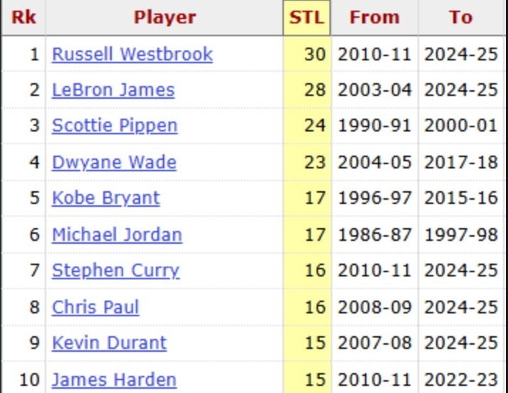 目前,勒布朗·詹姆斯已经送出两次抢断,他的圣诞大战抢断总数来到30个,追平威少,并列历史第一多。