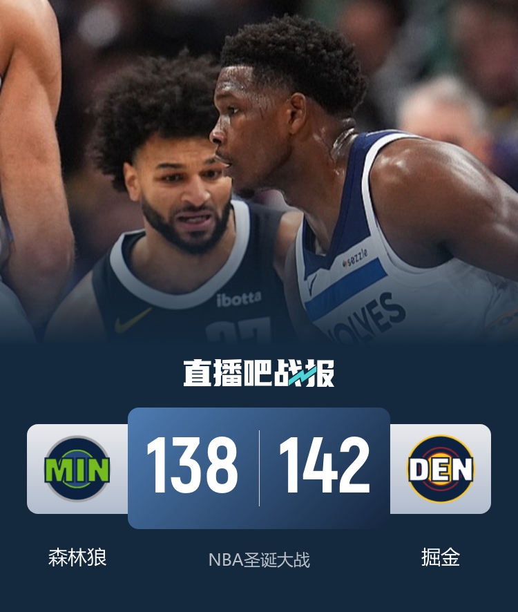 首节开打后爱德华兹单节独取14分,约基奇火热对飚单节18分强势回应,掘金后程发力逐渐占优,首节结束时掘金领先3分,次节回来,掘金进攻突然断电,森林狼轰出17-0进攻高潮,穆雷联手约基奇回敬9-0攻击波,半场战罢,掘金依然领先2分。易边再战后掘金延续火力确立两位数优势,中段森林狼一度缩小分差,但约基奇稳住局势,掘金领先14分进入末节,末节上来,森林狼一波16-2拉回悬念,决胜时刻爱德华兹极限三分绝平,约基奇超远绝杀未果,双方进入加时,爱德华兹进入杀神模式,森林狼一波9-0占据先机,约基奇连中续命三分但失误被断,掘金挑战成功反吹戈贝尔犯规,约基奇笑纳两罚,穆雷夺命三分,爱德华兹遭夹击失误,随后爱德华兹延误比赛+不满判罚连吃3T遭驱逐,掘金连中罚球收下比赛,最终掘金142-138力克对手。
