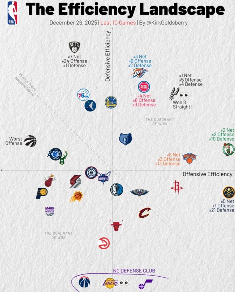 直播吧12月27日讯 今天,美媒Kirk Goldsberry晒图统计了NBA过去10场比赛所有球队的攻防效率,详情入下: