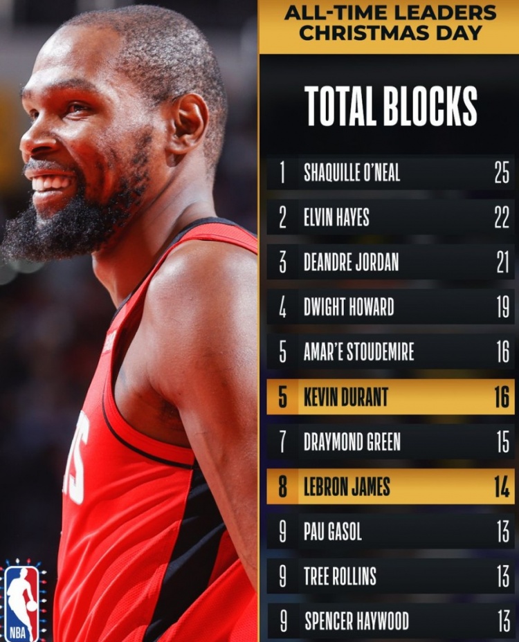 在本场比赛过后,杜兰特(16)在圣诞大战盖帽榜上升至并列第五,詹姆斯(14)上升至第八。
