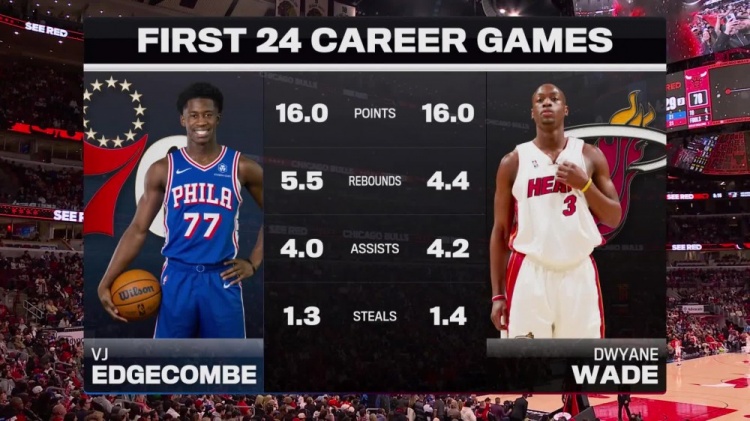 >生涯前24战场均数据:埃奇库姆16+5.5+4+1.3 韦德16+4.4+4.2+1.4