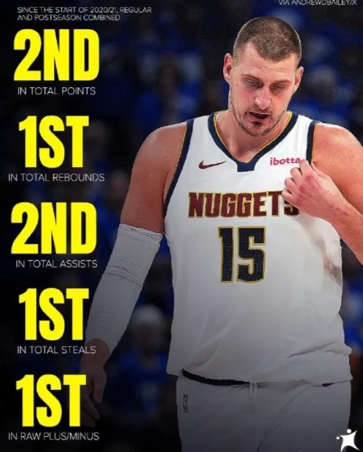 2020夏天至今所有比赛,约基奇12401分5638个篮板球4101个助攻649个抢断,全部联盟第一。
