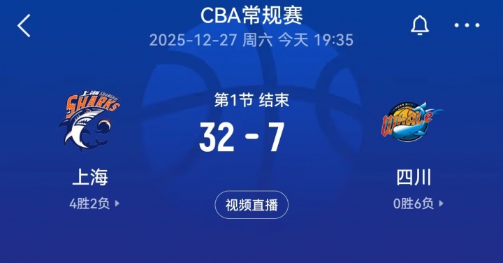 直播吧12月27日讯 CBA常规赛第7轮,四川首节7-32落后上海。