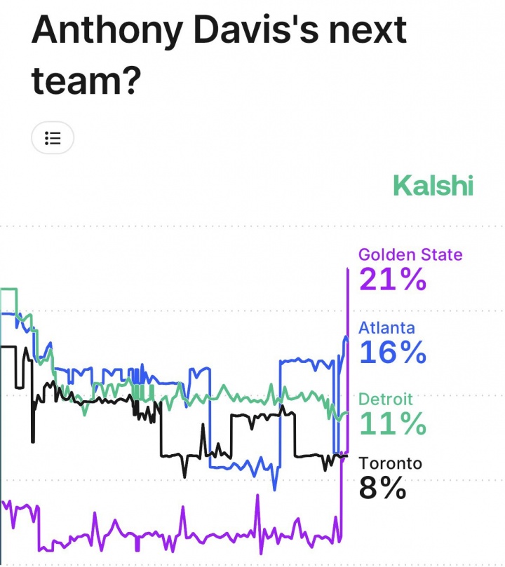 据美国预测市场平台Kalshi Sports最新预测,勇士(21%的概率)是浓眉最热门的下家。