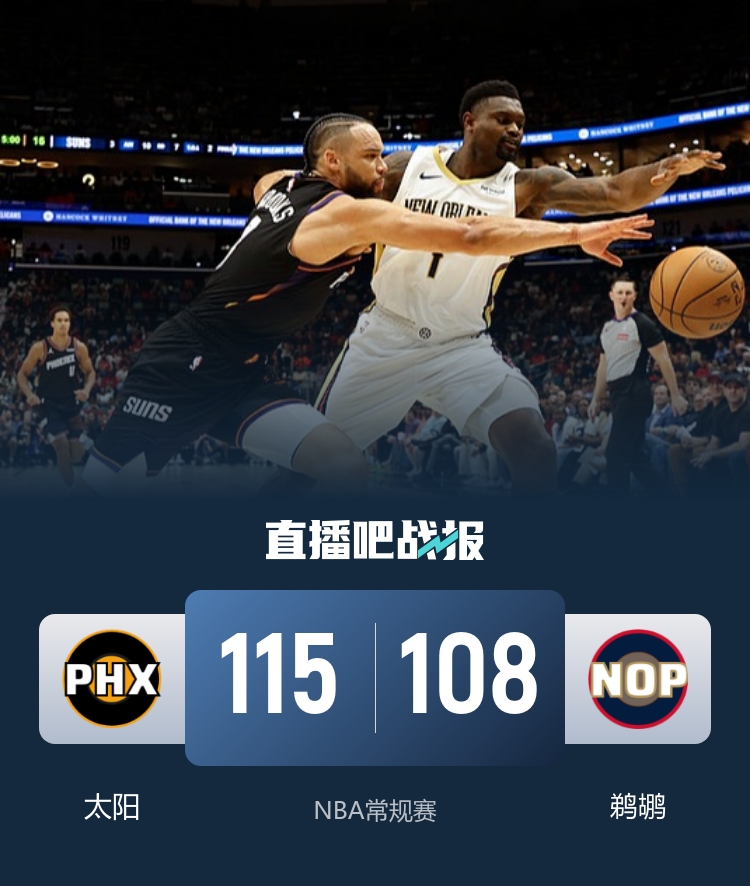 比赛开始,鹈鹕开局不到2分钟就挑战失败,太阳顺势8-2开局,但鹈鹕全民皆兵给出回应,双方展开拉锯战,首节太阳领先3分,次节鹈鹕连续三分反超,但太阳稳扎稳打还是9-0重新建立主动权,半场太阳领先5分。下半场,马威继续内线取分,太阳一度领先到近10分,但墨菲和贝连续暴扣止血,阿尔瓦拉多追身三分咬住差1分,双方展开胶着拉锯战,末节太阳断电被鹈鹕10-4反超,但布克里突外投连砍6分反超回来,马威内线继续得吃得喝,比赛进入白热化,布克助飞马威空接暴扣领先到5分,最终太阳115-108力克鹈鹕。