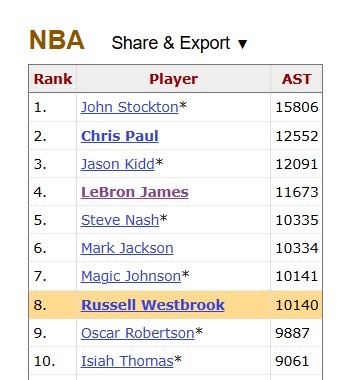 >超越传奇!威少生涯助攻达到10142次 超越魔术师独占历史第七!